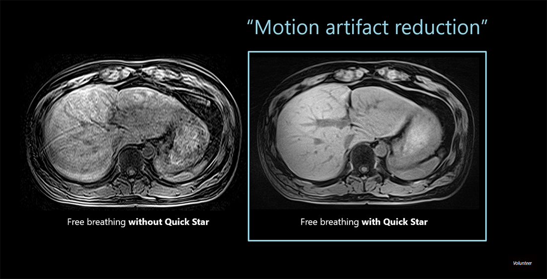 Sin necesidad de contener la respiración. La tecnología ©Quick Star permite realizar estudios con respiración libre. Esto es especialmente útil en pacientes que no pueden contener la respiración con facilidad, como ocurre en estudios hepáticos y abdominales, o en pacientes pediátricos.